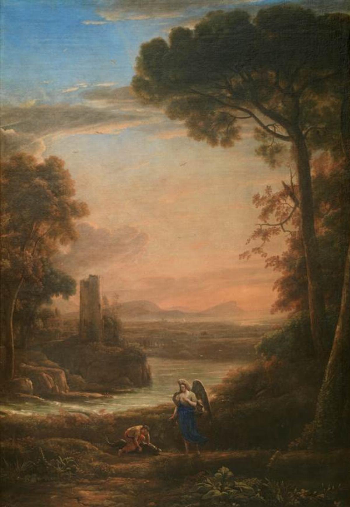El primero se titula “El Arcángel Rafael y Tobías” de Claudio de Lorena (también conocido como Claude Lorrain o Claude Gellée). Es un óleo sobre lienzo pintado entre 1639 y 1640. Es de considerables dimensiones: 211 x 145 cm. En el cuadro tres quintas partes corresponden al cielo. Abajo puede verse a Tobías con el gran pez; un pez que tiene una cabeza parecida a la de un cocodrilo. A su lado el Arcángel. El paisaje tiene un sugerente aire onírico.