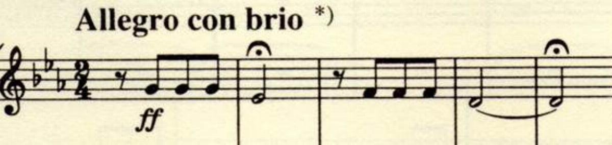 “Así llama el destino a la puerta” dijo, al parecer, Beethoven. Fíjense en que el segundo calderón es más largo; una blanca ligada con otra blanca. Infinidad de directores interpretan los dos con la misma duración. En su ensayo “Sonido y palabra”, Wilhelm Furtwängler insiste sobre este punto y lo razona brillantemente. Estos compases “cumplen la función de un lema, de una inscripción con respecto al resto de la obra. Sólo después empieza la obra propiamente dicha”. En efecto, si se tocan con la misma o casi la misma duración parecen un ensayo de lo que viene a continuación, por lo que pierde su sentido transcendente. Debe sonar separado del resto.