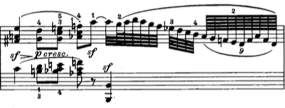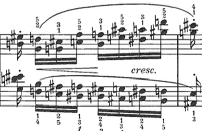 La primera célula de cuatro notas es f y ¡cresc ! Mucha gente las toca todas igual.La respuesta es piano, cresc y dim. Acabo de ver en internet a una famosa joven pianista y al ganador del concurso Tchaikovsky de hace bastantes años tocar los dos motivos exactamente con la misma dinámica. Forte y otra vez forte. Ningún diálogo, ningún espíritu, ningún dramatismo. La mano izquierda tiene sus propios cresc y dim independientes de la derecha. Si se hace bien, la riqueza expresiva se multiplica. Cuidado con el pedal a lo largo de todo el estudio. Si se abusa de él, resulta decepcionantemente vulgar.