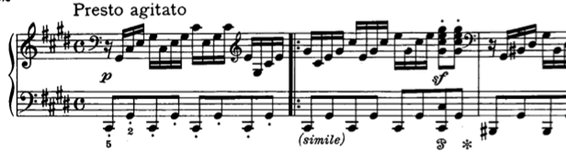 Presto agitato y 4/4, es decir todo lo contrario del primer movimiento. Beethoven indica piano; no hay crescendo en los arpegios ascendentes y el sf es dentro del nivel dinámico piano. Generalmente se tocan estos acordes en ff y como si estuvieran en una parte fuerte del compás. Hay que pensarlos como una anacrusa de lo que sigue. El crescendo no llega hasta el compás 7. Y por favor: aquí el primer tiempo es sólo una negra, no lo convierta en una blanca porque se pierde el energizante efecto de síncopa. El calderón es sobre una blanca con puntillo en Presto, no sobre dos redondas ligadas.