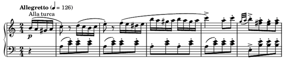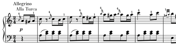Pocas obras de Mozart han sido tan maltratadas como la “Marcha Turca”. Está indicado Allegretto pero muchos la tocan a toda velocidad. Es una marcha, no una carrera. Por curiosidad estuve buscando vídeos de legionarios desfilando y comprobé que a ese tempo la interpretan con frecuencia. Aparte es el caso del singular Lang Lang que la toca a paso de legionario pero en una película muda. No sé a que velocidad marchaban los jenízaros, pero no creo que fuera tan rápido. En la última edición de Henle de 2015 pone Allegrino en vez de Allegretto, al parecer como resultado de las últimas investigaciones musicológicas, aunque este término y referido a esta obra, aparece ya en un libro titulado “The Musical World” editado en Londres ¡en 1841! No recuerdo esa indicación de tempo en ninguna otra pieza de Mozart pero eso no quiere decir que no la haya. La verdad es que el autor no dice en ningún momento la palabra “marcha”, sólo “Alla Turca”; sin embargo este redoble de tambor en la mano izquierda sugiere claramente que es una marcha.