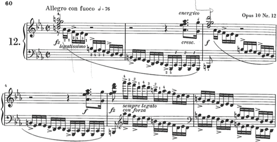 El estudio “Revolucionario” fue compuesto bajo la impresión de la insurrección en Polonia contra los rusos. Mucha gente lo considera un estudio para la mano izquierda. La verdad es que si tienes que trabajar esta obra para adquirir fuerza y velocidad en la mano izquierda, mal vamos. Los medios mecánicos tienen que estar ya resueltos. Para eso están Czerny, Clementi, Cramer, Moszkovski e infinidad de libros de ejercicios. Según mi opinión este es uno de los estudios que peor se interpretan. Para empezar suele tocarse demasiado lento. Ya sé que es difícil, pero no hay ninguna obligación de tocarlo. Casualmente ayer ví en Instagram un vídeo de Yefim Bronfman tocándolo a un tempo magnífico, ideal a mi entender. Para poder alcanzar la velocidad correcta (Allegro con fuoco, blanca=76) hay que pensarlo a 2/2 como dice la partitura y no a 4/4. Es muy útil cantar la melodía de la mano derecha para sentir ese tempo. Liberados de la dificultad física de la izquierda encontraremos más fácilmente el carácter de la obra. Ya desde el primer acorde aparecen los problemas:
