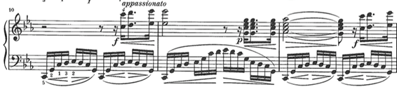 ¿De verdad las garrapateas son más lentas que las semifusas aunque se toque con un cierto rubato? Schnabel, alumno de Leschetizky que a su vez lo fue de Czerny, escribe en su interesantísima edición de las sonatas: ben in tempo. Tanto él, que a través de Czerny tiene una conexión directa con Beethoven, como Gould y Pollini apuntan en la dirección que yo digo. En cambio Rubinstein, Kempff, Gilels Ashkenazy, Lupu, Barenboim, Gulda y otros grandes pianistas tocan las últimas garrapateas más lentas que las semifusas. Si se interpreta con la aceleración del ritmo que está escrita el sentido es totalmente diferente; es como deslizarse por una pendiente cada vez más rápido. De este modo el grupo de nueve notas que desemboca en la tónica de mi bemol mayor impulsa los acordes de semicorcheas de la mano izquierda en el compás 5. Por cierto, Beethoven escribe piano, cresc y sf. No es fortissimo, por lo que no hay que golpear la octava si bemol de la mano izquierda como tanta gente hace.