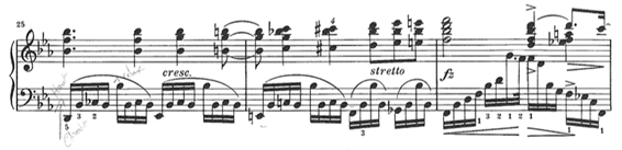 Al final de este extraordinario pasaje con síncopas, Chopin escribe stretto; muchos lo ignoran, al igual que la semicorchea con puntillo y la fusa de la mano izquierda en el compás 27, que no es más que un rubato escrito y que sirve precisamente para compensar el stretto anterior.