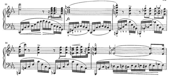 En el estudio “Revolucionario” quien lleva la carga dramática es la mano derecha, mientras que la izquierda aporta la energía. Deben ser muy independientes. En el siguiente pasaje (compases 55 al 57) se aprecia bien lo que digo. El ritmo de los acordes es muy particular; totalmente declamado, desgarrado, con un aire de improvisación; al mismo tiempo las semicorcheas de la izquierda fluyen furiosas arriba y abajo con un ritmo regular.