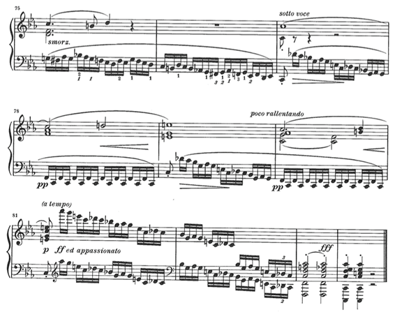 Otro momento importante: la amiga de Rachmaninoff, Marietta Shaginian, cuenta que el compositor le dijo que toda obra tiene un “punto culminante” al cual hay que saber llegar: “Ese punto (...) puede hallarse al final o a la mitad de la obra, ser de gran intensidad sonora o muy suave...” ¿Dónde está el “punto” del primer movimiento de la Patética? Aquí , sin duda: