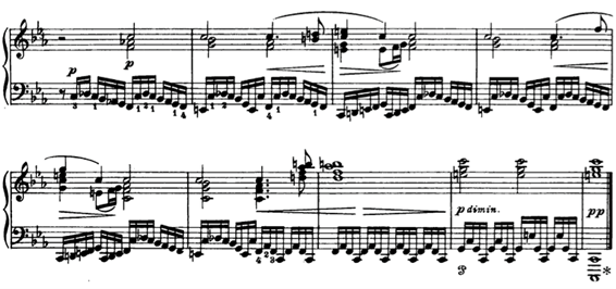 El último grupo de nueve notas está escrito con garrapateas que, como todo el mundo sabe, valen la mitad de una semifusa. La mayoría de los pianistas tocan las garrapateas casi a la misma velocidad que las anteriores semifusas y además hacen un pequeño (o gran) ritardando al final, en las cuatro o cinco ultimas notas, antes de reposar sobre la tónica de mi bemol mayor en el compás 5.
