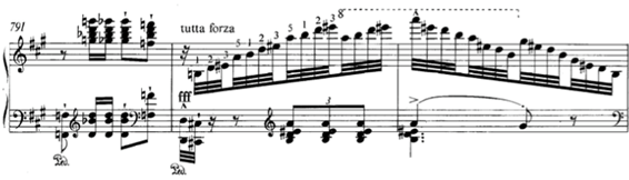 Para terminar, un pequeño apunte sobre el Mephisto Vals nº1 de Liszt: en el compás 792 y siguientes, en el explosivo punto culminante antes de la coda final, dividida en varias partes, encontramos dos octavas (tutta forza) en la mano izquierda; dos fusas, que ¡ deben sonar con el mismo pedal! ¡Debe escucharse la disonancia re-do# ! No sólo el do#. Produce un potentísimo efecto orquestal de golpe de platillos. Liszt es un visionario absoluto: transforma la técnica del piano, la técnica de la transcripción, crea el género del poema sinfónico, es un pre-impresionista, un pre-expresionista, un pre-atonal...